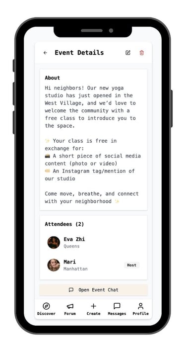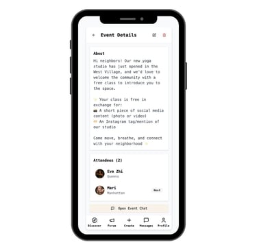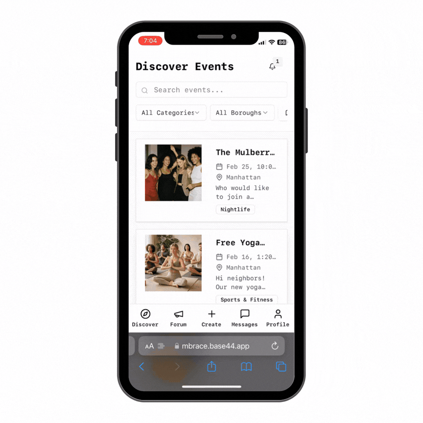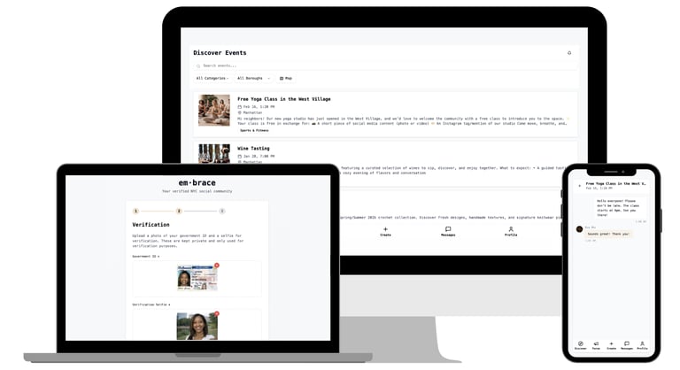 The em·brace App is a women-focused social platform designed to help you discover NYC events, meet inspiring women, and build real friendships and professional connections through a safe and inclusive female community.